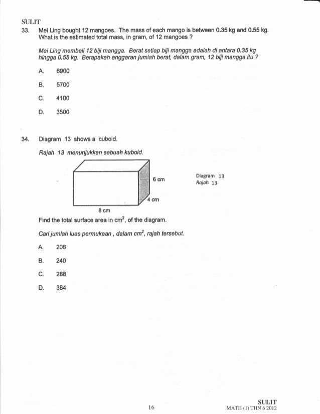 Soalan percubaan upsr matematik terengganu 2019